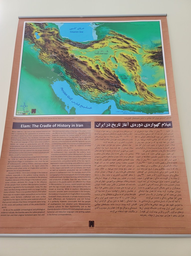 I arrived to the National Museum of Iran, but accidentally made a full circle around the building because I was looking for the entrance, and had already passed by it. I spotted a tour bus parked nearby, and many Chinese tourists eager to go inside. I went through the gate, bought my ticket, answered the usual small talk of where I come from, and saw yet another surprised reaction that I’m the first they’d seen. Whenever people find out where I’m from, it’s an extra push for me to be more mindful about being the best possible representation (whilst still being my authentic self, of course). There are two museums once you get through the gate. One building is ancient Iran, running from the Bronze Age to the Sassanid era, and another one is for post-Sassanid (post-Islamic) Iran. Both museums had a vast collection of artefacts, statues, manuscripts, cuneiform slabs, and material culture on display. There were little captions in the glass display cases, and larger signage on the walls for more historical context. However, it was not as engaging. The way of presenting history should be accessible and inviting to the general public; museums should make information processing and learning instant, so the clients do not have to exert themselves in learning with too much advanced information. In this museum (same as the museums I visited in Egypt and even in Greece), you walk through a labyrinth and are overwhelmed with information, so you kind of fend for yourself. It helped that I walked in with an understanding of ancient Near Eastern/West Asian civilisation, so whilst I still had to reorient myself with every new room I entered, I was still able to enjoy the museums, and spent several hours getting intimate with the histories.