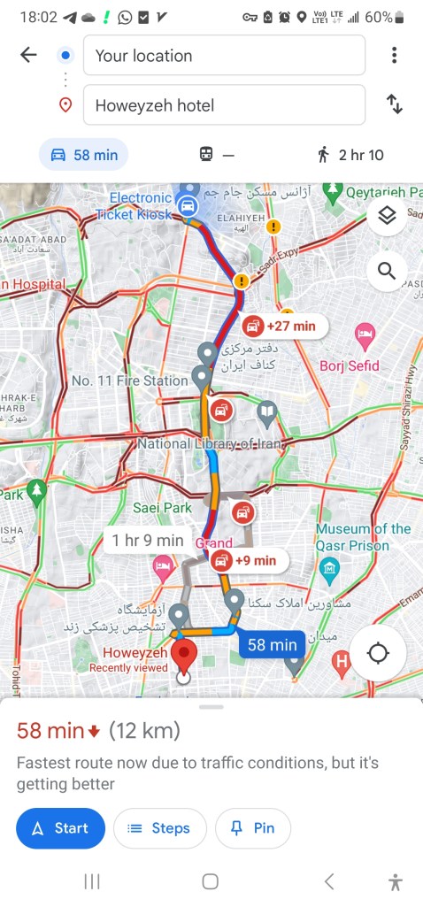 Leaving the supermarket empty-handed, I found a cool flower kiosk, and took their card. Their card had a little bouquet on it. Outside the mall, I tried to order a Snapp. The walk to the metro station would take too long. So, I walked to a quiet residential corner where I could get a good view of the cab and where traffic would allow him to stop. The cab guy was Hossein. Thank God he didn’t call me prior to his arrival. Sometimes, the drivers will call you before they arrive, and I can never understand their fast and informal speech over the phone. Tehran rush hour: I got a little motion sickness in the car and was growing worried about how it would take us 58 minutes, basically one hour, to travel only 12 kilometers (north to south, mostly on Modares highway). The cab ride was 1,460,000 IRR (~2.30 USD).
